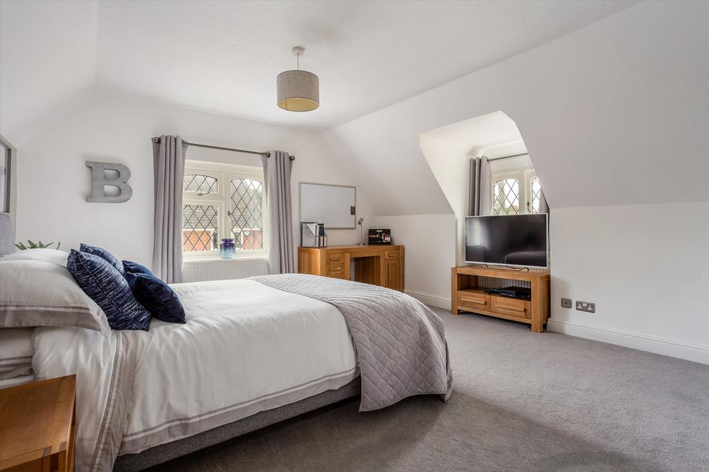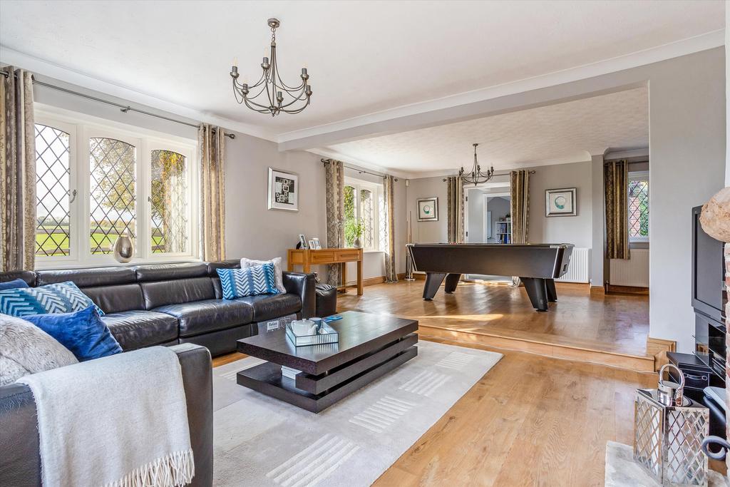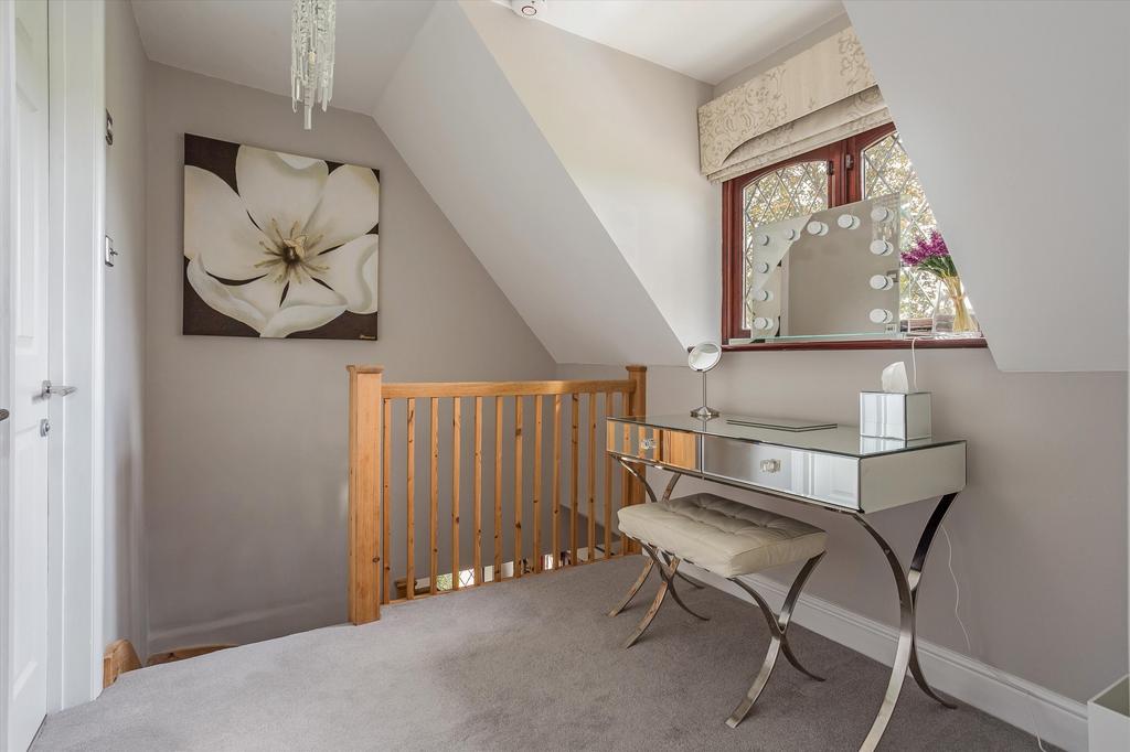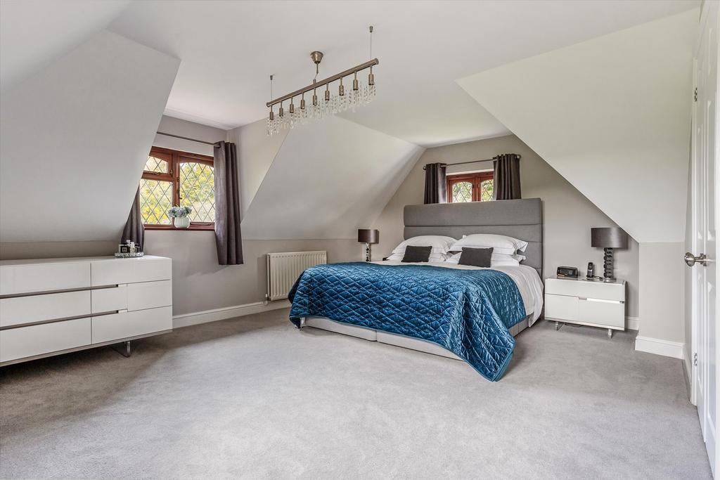 Upstairs is split into two halves whereby there are four bedrooms and two bathrooms. The principal west facing bedroom is accessed via a separate staircase or through a 'Jack and Jill' bathroom suite. There is a generous landing at the top of the staircase that can be used as a dressing area. The principal bedroom is triple aspect with views overlooking the fields at the front and views overlooking the pond at the rear. There is another staircase that can be accessed from the games/sitting room which leads up to three bedrooms and a family bathroom. The third bedroom also has access to the 'Jack and Jill' bathroom. .