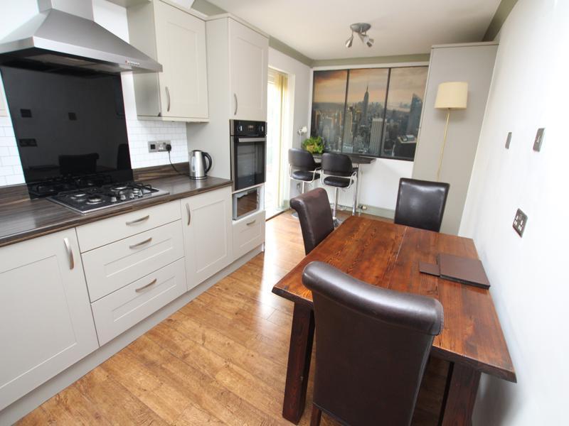 Dining Kitchen - 6.81m x 2.64m (22'4" x 8'8") - Modern fitted dining kitchen having a range of wall and base units incorporating stainless steel sink unit, stainless steel oven and hob, breakfast bar, radiator.