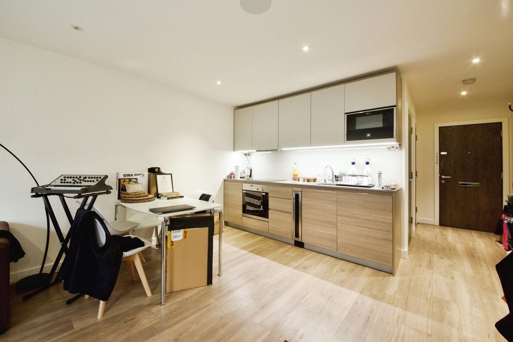 Living Space/Bedroom - Bright and spacious open plan living space and kitchen offering ample space for furniture for both living, dining and bedroom purposes, with wood laminate flooring throughout, a double glazed window, a sliding uPVC double glazed door to the private patio, a fitted unit with shelves and base cupboards, an electric radiator and ceiling spotlights. The kitchen is fitted with a range of custom modern wall and base units with complementing worktops and splashbacks, underlights, an inset sink basin with a drainer and mixer tap and an integrated set of high spec appliances.