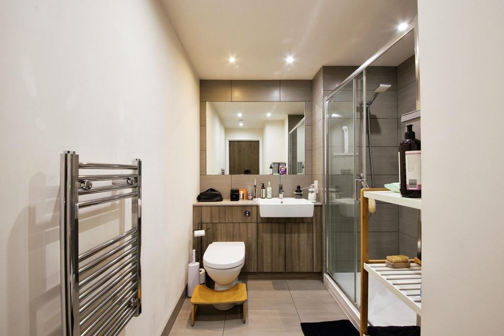 Shower Room - Modern suite comprising a push-button WC and a wash hand basin set into a vanity unit with a worktop, shaver point and mirror above, a large step-in glass shower, tiled flooring and splashbacks, a heated towel rail, an extractor fan and ceiling spotlights.