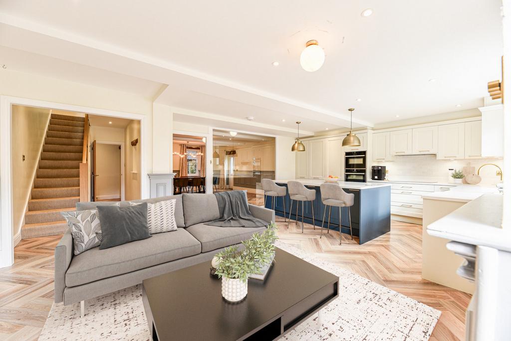 The ground floor is designed for sociable, open-plan living, with a designer kitchen, dining area and reception room flowing seamlessly together.