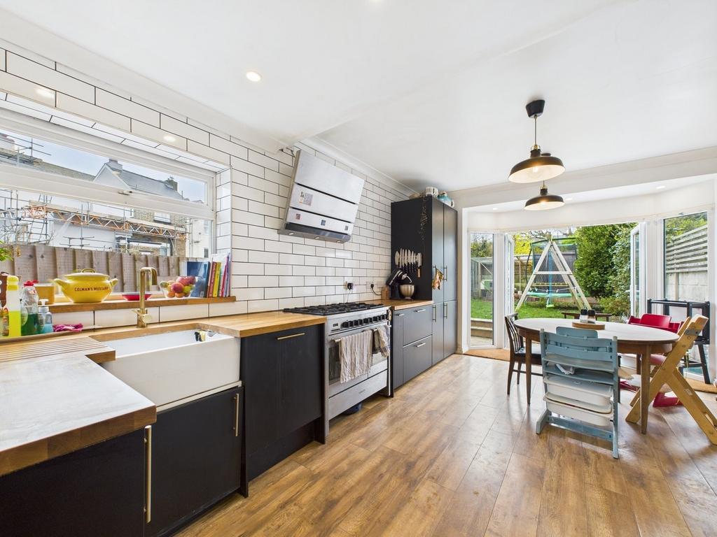 5.62m x 2.70m (18' 5" x 8' 10") Bright and airy double aspect room with a double glazed window to side and double glazed French doors to rear garden. The kitchen features low level units, ceramic sink unit inset to wooden countertops, freestanding range cooker with gas hob and extractor hood over, brick exposed fireplace with log burner, radiator, integrated fridge-freezer and dishwasher, tiled walls and wooden flooring.