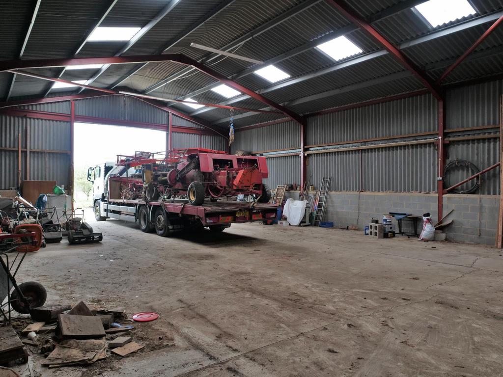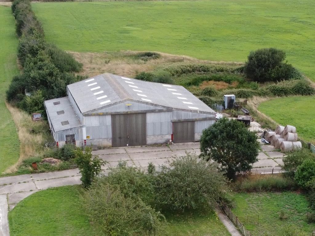 The farm building is a general purpose barn (18.25m x 22.20m) of steel portal frame construction with mainly concrete block walls to approximately 1.50m and corrugated asbestos cladding above and roof. The building is divided into 3 sections and has a concrete floor throughout. The principal section (12.25m x 18.25m) is clear span and has a sink in one corner, electric sockets, strip lighting and double sliding doors to the front. Either side of the main span are lean-tos. On the west side the lean-to has a part sleeper part space board wall to the side, and to the front a single sliding door. On the east side is an area with a lower eaves height that is used as a workshop..