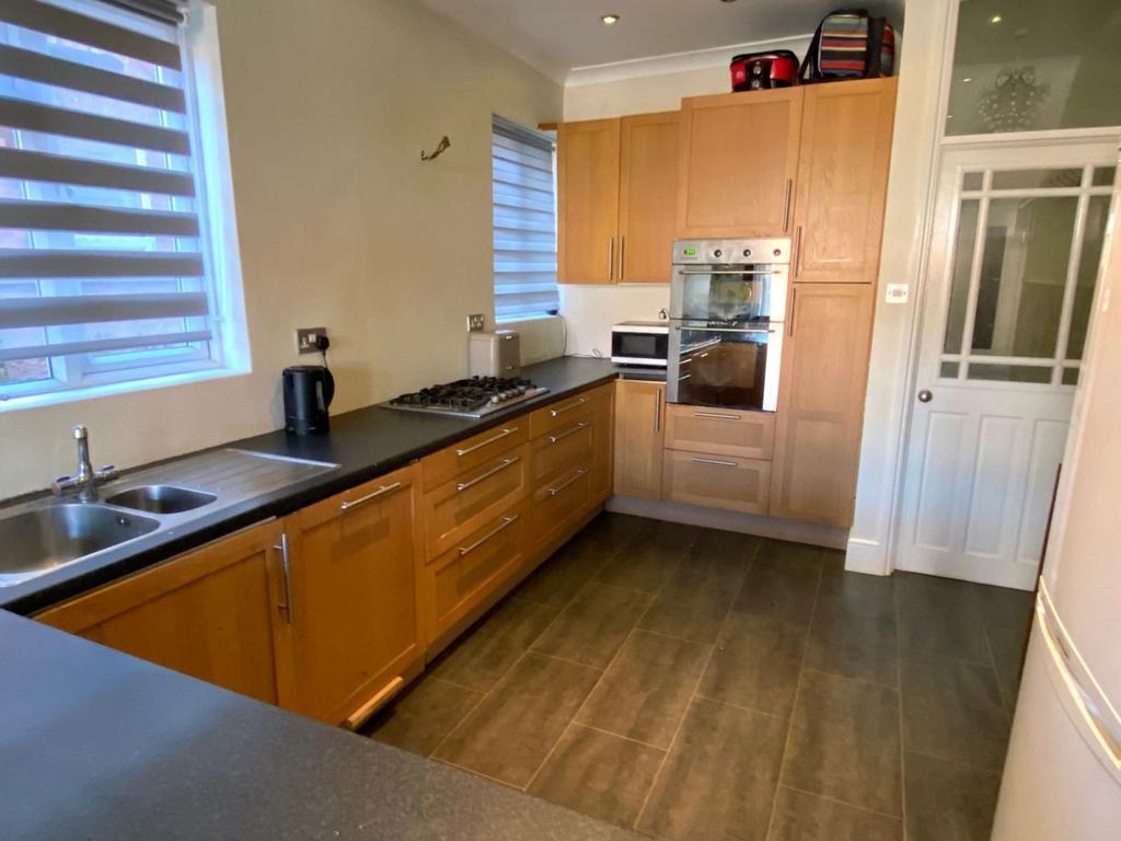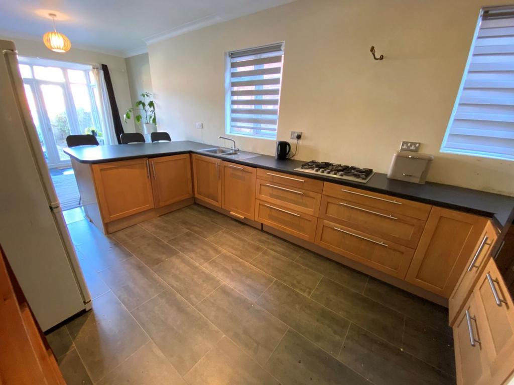 UPVC double glazed windows to side elevation. UPVC double glazed bay window with French doors to garden to rear elevation. Fitted with a range of wall mounted and base level cabinets and drawers with roll top work surface over. One and a half bowl stainless steel sink and drainer unit with mixer tap over. Five ring gas hob, eye level double oven. Space and plumbing for white goods. Breakfast bar and space for stools. Space for dining furniture. Radiators. Television point. Tile effect laminate flooring.