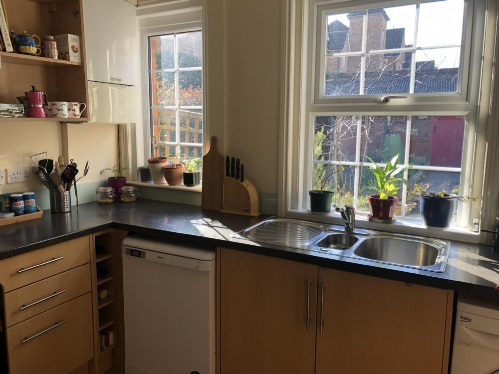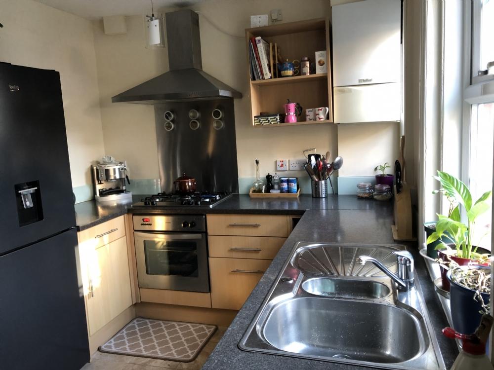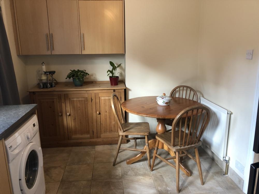 5 ring gas stove. Electric ovenCupboards / DrawersOne & half sinkWashing machineDishwasher Large fridge freezer Dining table/chairsFloor tiles RadiatorBack door leading to garden