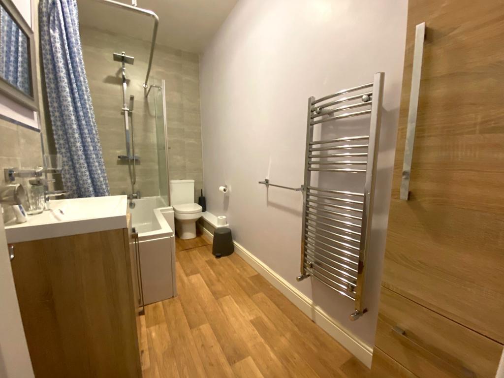 Modern bathroom with oak coloured flooring, bath and thermostatic shower, modern fitted basin and vanity cupboard.