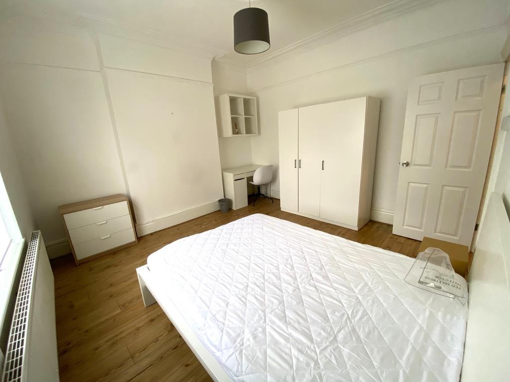 Upstairs the front bedroom is a very large room with grey coloured carpet, Ikea double bed, desk, chair, 3 door wardrobe, 3 drawer chest and 2 drawer bedside table.