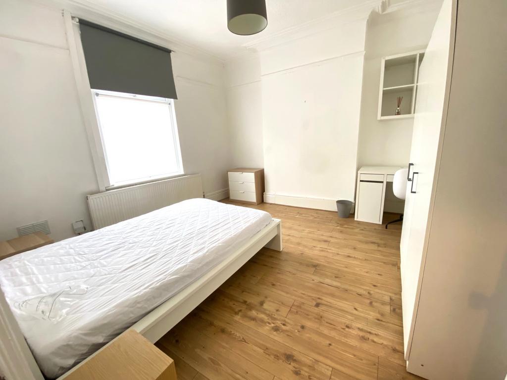 The front entrance hall has oak coloured laminate flooring and leads to a very large downstairs front bedroom with laminate flooring, Ikea double bed, desk, chair, 3 door wardrobe, 3 drawer chest and 2 drawer bedside table.
