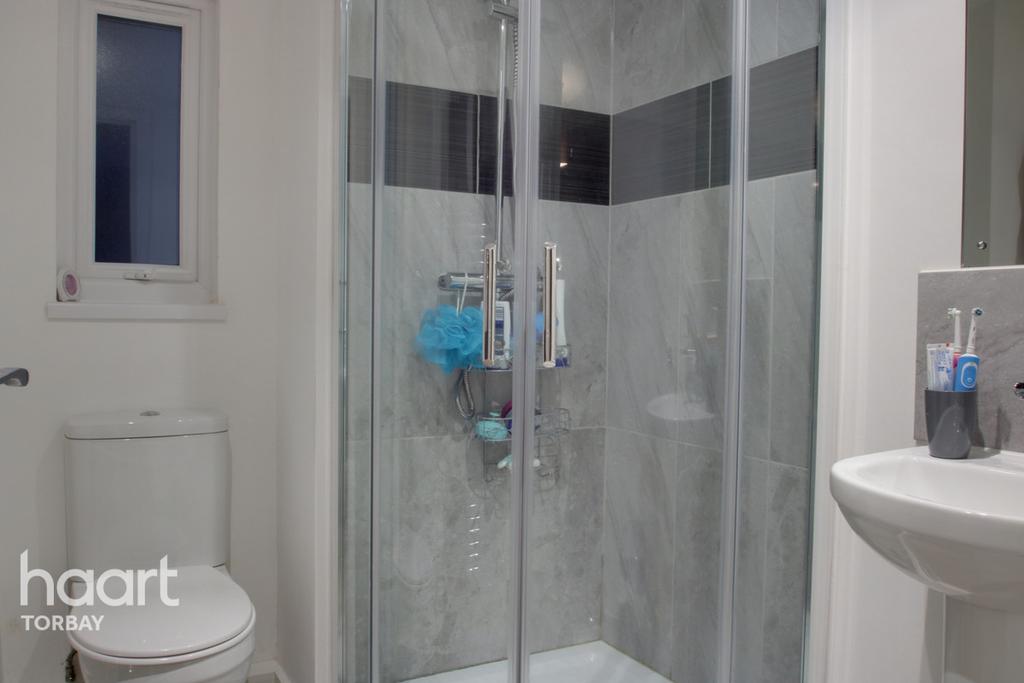 PVCU Double Glazed window to rear, corner shower cubicle with splash-back, low level WC, pedastool wash hand basin with mixer taps over and splash-back, wall mounted towel rail and extractor fan.