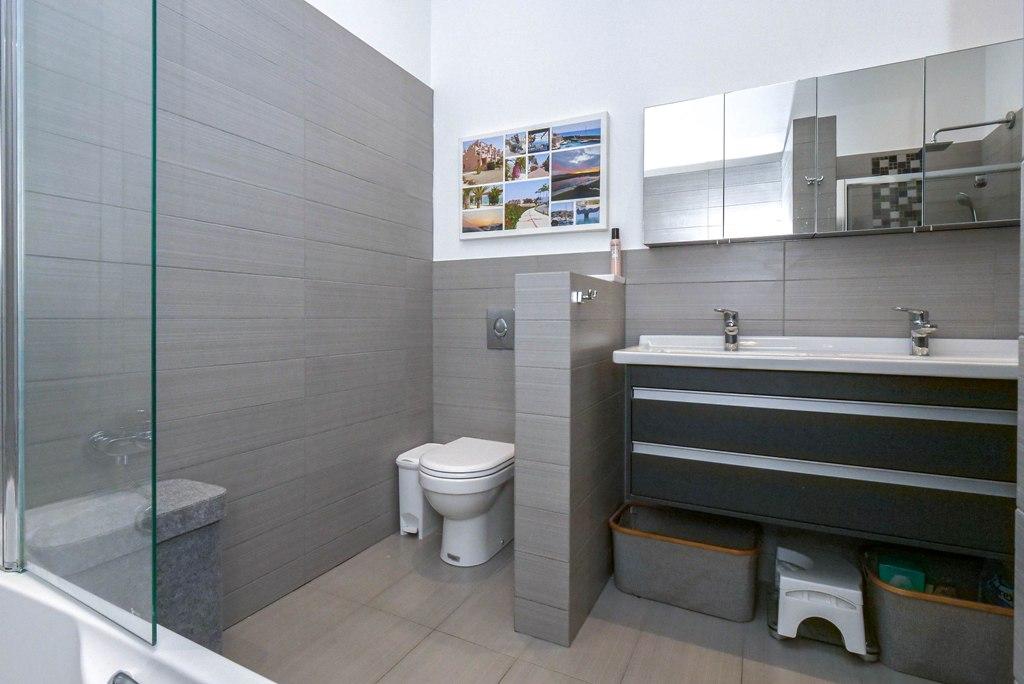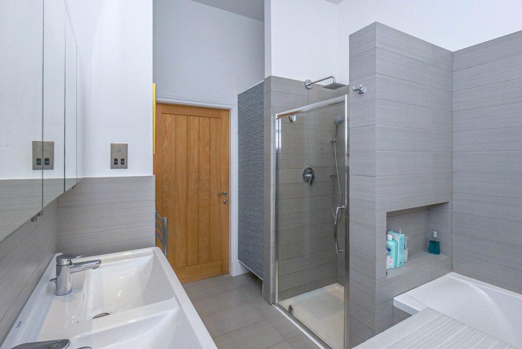 A beautiful, substantial luxury bathroom comprising bath with shower over, large separate shower with internal shelf, W.C, double hand basins & recessed storage.