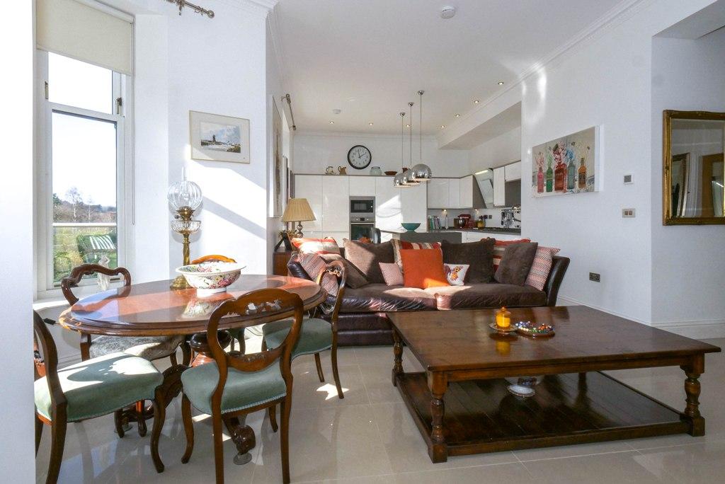 Very generous, bright living space located to the front with dual aspect full-height windows providing beautiful views over Macrosty Park and beyond. Open to the superior Breakfasting Kitchen which has a full range of quality wall & base units. Integrated double oven, hob, washer/dryer, dishwasher and double fridge freezer. Central island/breakfast bar. Double doors to private balcony.