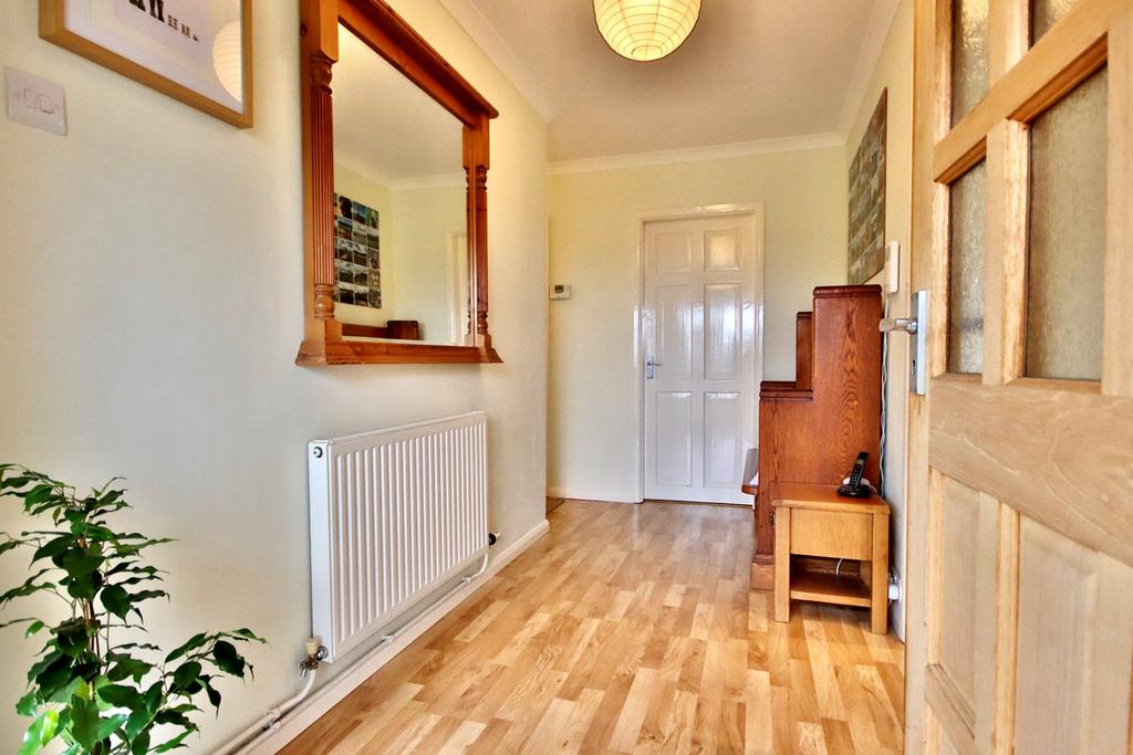 Approached by a gated brick paved driveway with garage. Laid to lawn mature front garden with hedge surround and side gate through to rear garden. Outside wall light point and front door with access to..