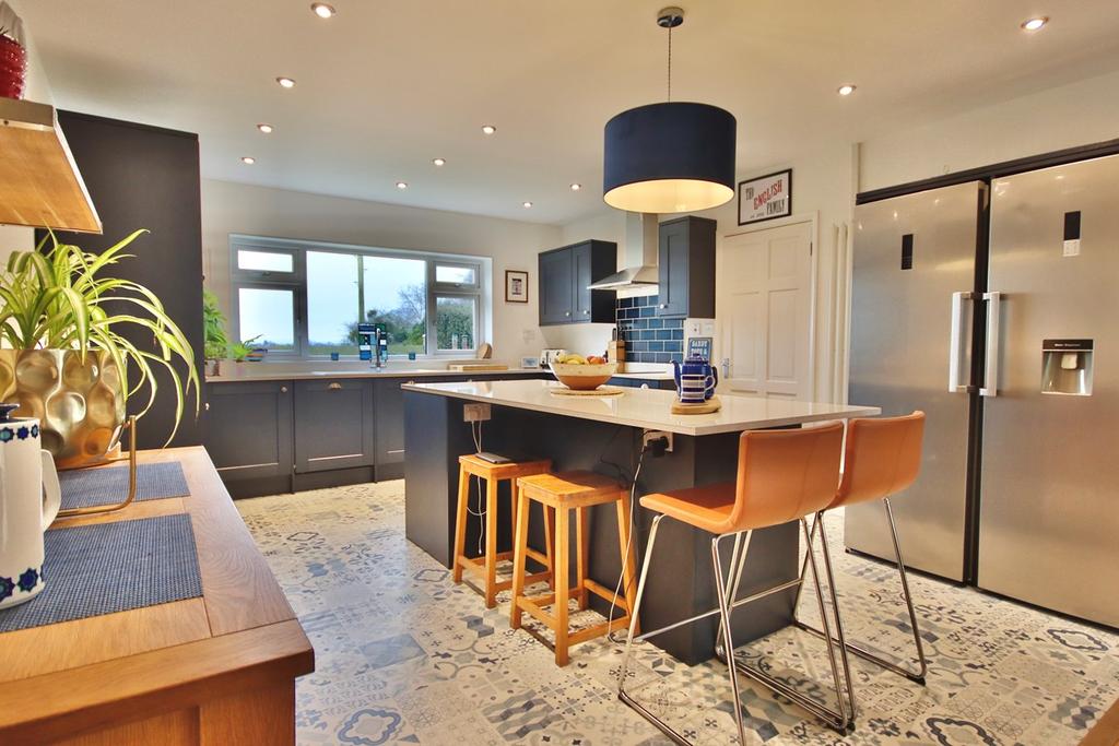 14' 2" x 28' 0" (4.32m x 8.53m) Modern high specification kitchen with matching base and wall carousel cupboards maximised for storage. The kitchen offers a wide range of integrated appliances including; 1.5 sink with chrome mixer tap and drainer, tall double electric oven, larder fridge/freezer, dishwasher, four circle hob unit and extractor fan. Feature breakfast bar island with further storage. Double glazed windows with stunning views of the Malvern Hills and Worcester Cathedral Spire. Tiled splashback and contemporary flooring. Tall radiator unit, recessed ceiling light points and pendant light points. Patio doors with access to conservatory.