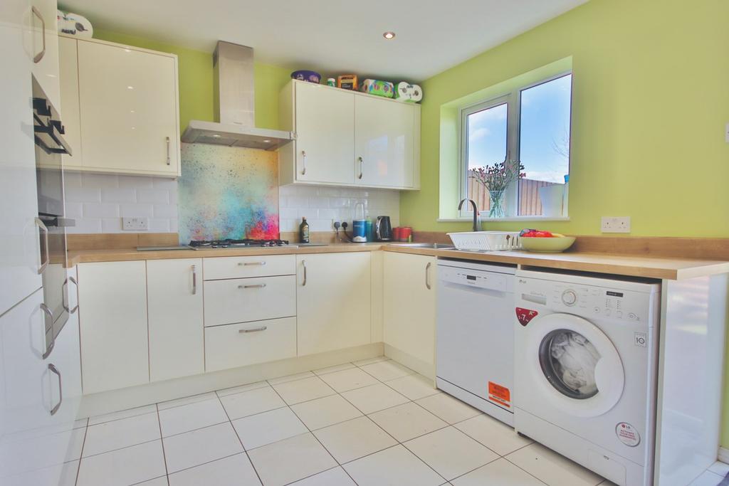 10' 1" x 14' 10" (3.07m x 4.52m) Modern style fitted kitchen with base and wall storage cupboards featuring integrated; Fridge/freezer, 1.5 sink with chrome mixer tap and drainer, double electric oven, four circle hob unit and extractor fan. Recess for dishwasher and washing machine. Tiled splashback and flooring. Double glazed windows and patio doors through to rear garden. Recessed ceiling light points and radiator.