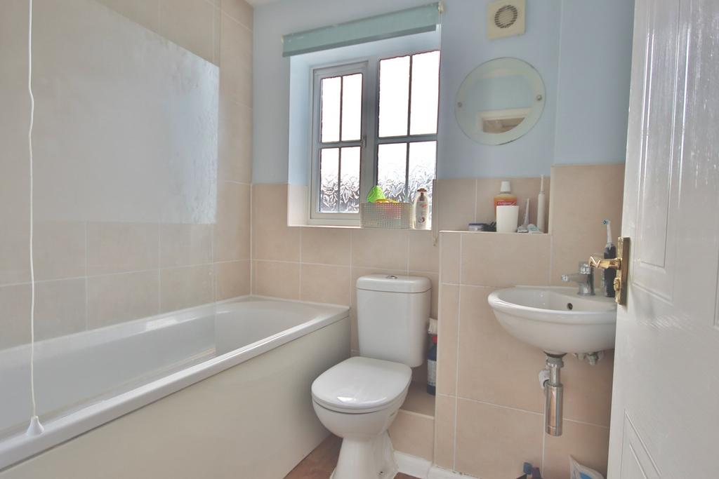 Bath with wall mounted mixer shower. Low flush unit toilet and sink. Obscured double glazed window through to front aspect. Tiled splashback. Ceiling light point and radiator.