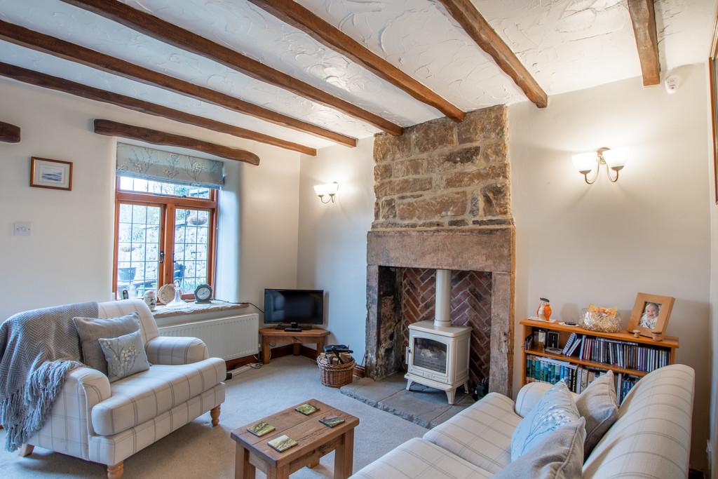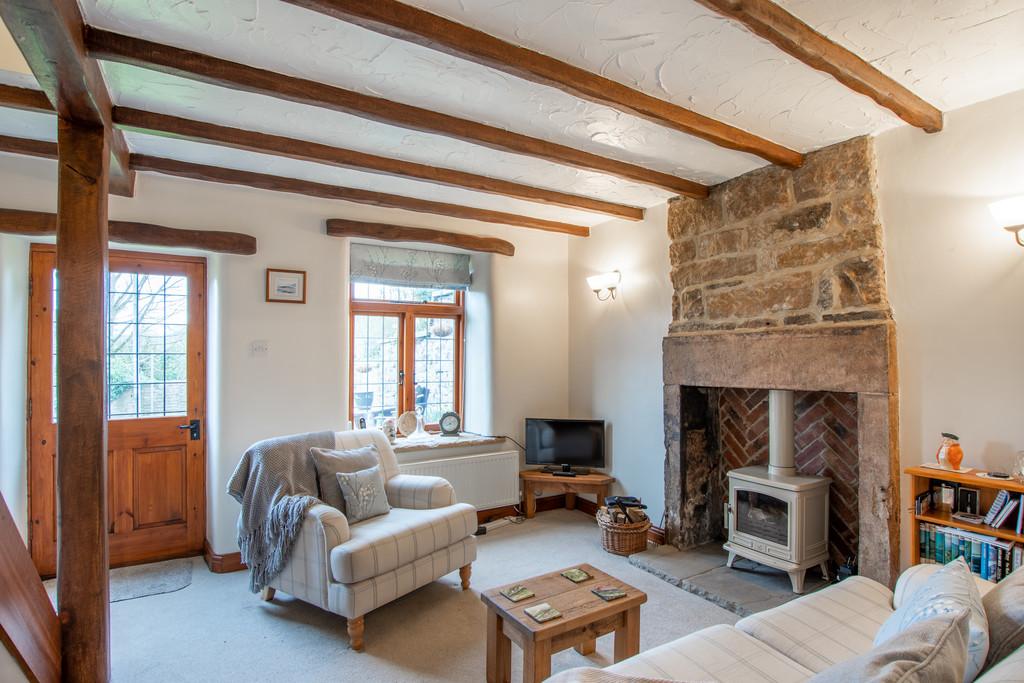 A latched door leads to a sitting room with lovely front facing aspect and brick backed herringbone fireplace with wood burning stove. From the front of the property there are lovely views across the garden of the village of Hathersage and a door provides access to the front garden.