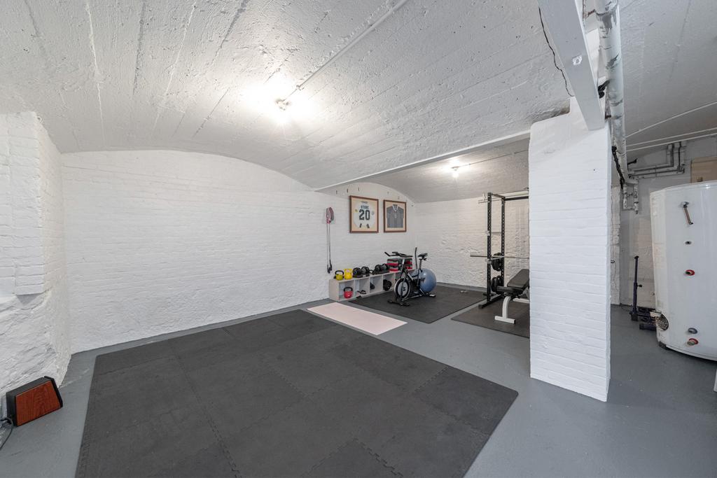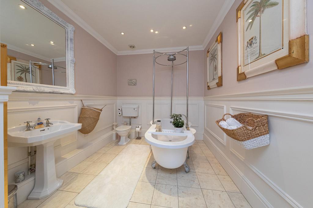 To the rear of the property is the fabulous breakfasting kitchen and the warm heart of the home; a room of generous proportions, it benefits from a tumbled limestone floor and a fine range of bespoke units and display cabinetry with marble work surfaces and a central island with complementary oak surface. Integrated appliances include an oil AGA with four ovens housed in a decorative inglenook with ambient lighting and two larder fridges. There is room for a combination microwave and plumbing for a dishwasher. To the rear of the room is a lovely breakfasting area, ideal for less formal dining, set into a bay window with window seats and French doors to the rear garden. Off the kitchen is a lobby which leads to a useful utility room and staircase down to the wine cellar and storage area. Divided into three separate spaces it is currently used as a gymnasium with two storage areas, one of which houses the boiler. Depending on individual requirements this space could lend itself to a host of uses. A downstairs cloakroom and separate WC complete with original mosaic tiling to the floor, wood panelled ceiling and stained glass windows completes the downstairs accommodation.