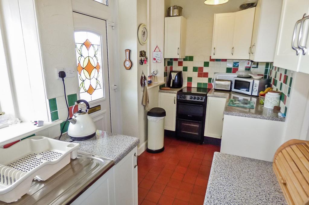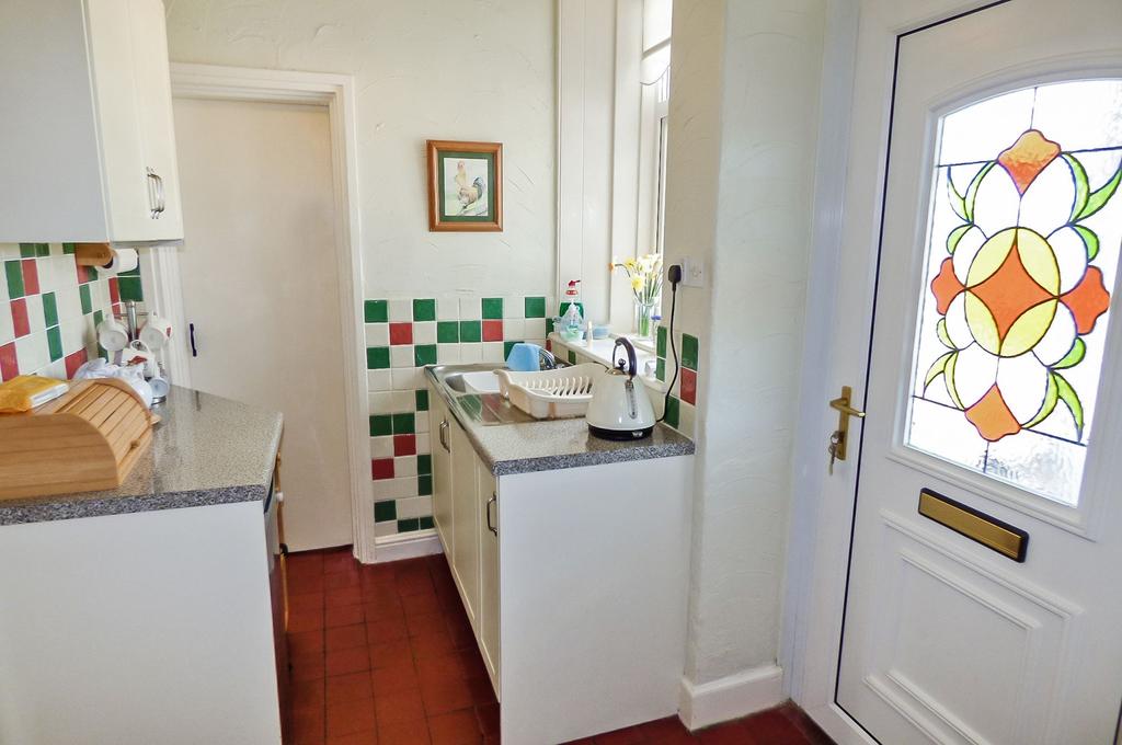 A modern fitted kitchen with a good range of wall, floor and drawer units, laminate roll top worth surfaces, tiled splash backs, stainless steel sink and drainer under the uPVC double glazed window to the rear, central heating radiator.