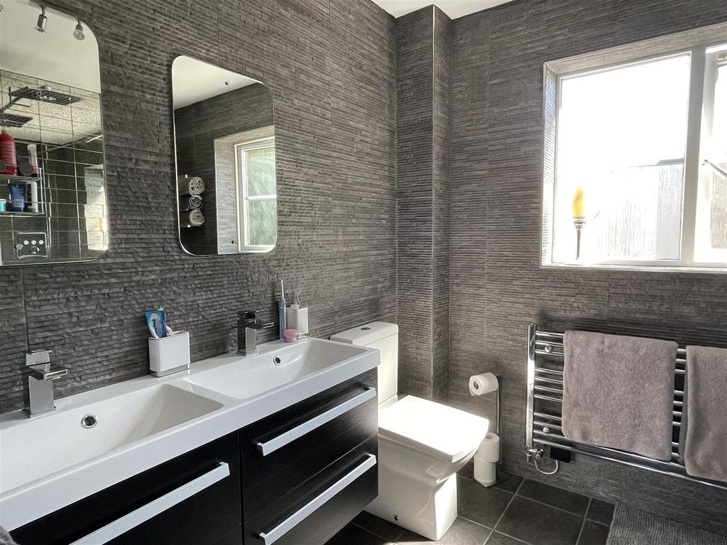 En-Suite: - 2.38m x 2.15m (7'9" x 7'0") - Upvc double glazed window to side elevation with patterned obscure glass. Updated matching shower suite comprising low level flush square WC with dual flush and soft close technology, matching his and hers ceramic hand wash basins both with central mixer taps, both with drawer storage below and his and hers mirrors above each, open shower enclosure with wall mounted shower complete with detachable body nozzle and overhead nozzles. Tiled walls. Tiled flooring. Large heated towel rail. Fitted extractor fan.