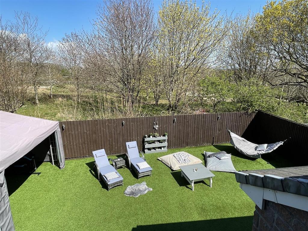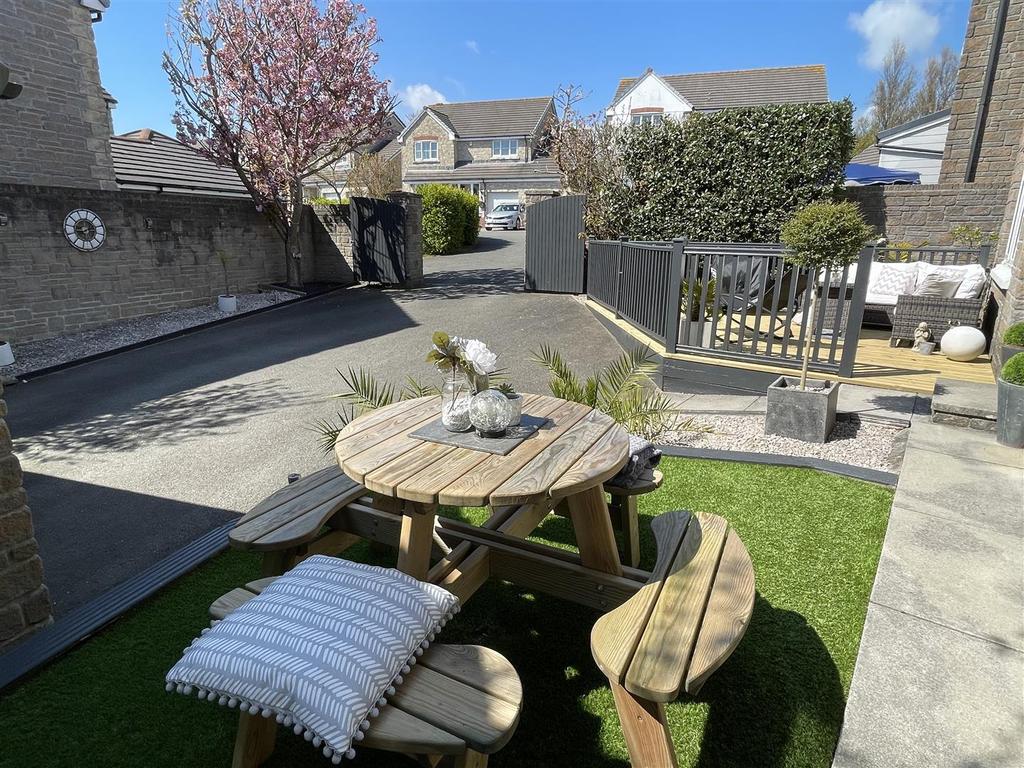 Outside: - Accessed at the very end of a no through road, and occupying an extremely quiet setting. Twin wooden gates open to provide access to the spacious drive and enclosed plot. The tarmac drive provides off road parking for numerous vehicles and is well enclosed with high level stone wall to front and right elevations with wood fencing to the rear elevation. To the right hand side there is area of chippings. To the left hand side, immediately inside the gates. is a elevated area of decking enclosed with wooden balustrade, an area that catches a great deal of sun, and steps lead up to the provide access to the front door. To the right hand side of the front door is an elevated area of astro turf, also catching a great deal of sun with a sunken stone chipped area below. At the front is the detached double garage.