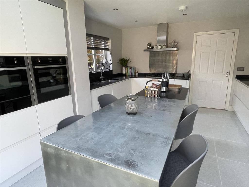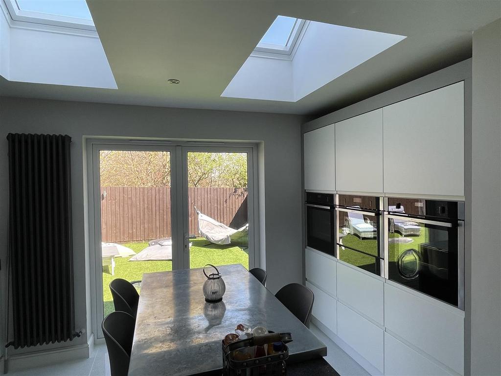 Kitchen: - 4.84m x 3.82m (15'10" x 12'6") - A truly fabulous kitchen with Upvc double glazed patio doors to rear elevation, two ceiling mounted double glazed Velux windows and further Upvc double glazed window to right hand side elevation all combining to provide tremendous natural light. The kitchen offers matching wall and base kitchen units finished white high gloss with buttonless soft close technology. The kitchen benefits from built in dishwasher, two built in ovens with central built in microwave with high level storage above and low level drawer storage below. Central island complete with in built waste disposal and offering additional work space with zinc breakfast bar. Polished black granite work surfaces with matching splash back. Stainless steel one and a half bowl sink with central mixer tap. Fitted five ring mains gas Neff hob with large extractor above and stainless steel splash back. Tiled flooring. Space for American style fridge freezer. Upright radiator. The kitchen also benefits from intelligent storage.