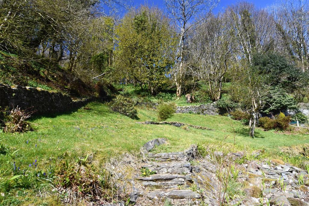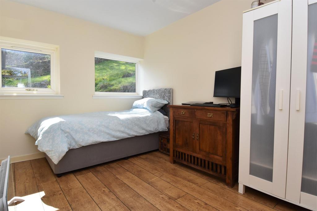 The back garden is mainly a grass area that rises upwards so that from the very back the elevated sea views are even more remarkable. There is an outdoor storage hut perfect for storing fuel for the stove while two sheds provide space for tools and outdoor equipment.