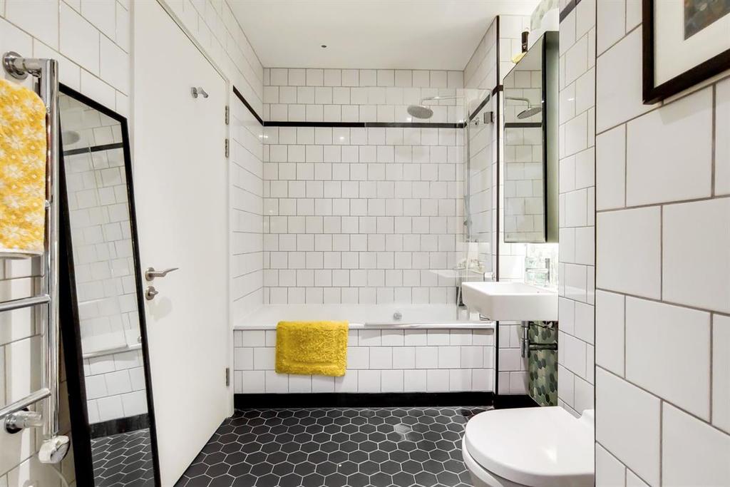 To your right, you'll pass through a private dressing-area alcove with an integrated wardrobe before stepping through into a modern and stylish bathroom, with a heated towel ladder, an integrated mirrored vanity unit, and a glass-screen, rain-style shower over a white bath – with the whole bathroom beautifully finished in white tiles and a honeycomb effect on the flooring.