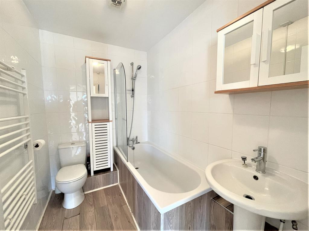 Bathroom - A three piece bathroom suite comprising: Low level W.C, pedestal wash hand basin and a panelled bath with overhead mixer shower. Laminated flooring and lighting point.