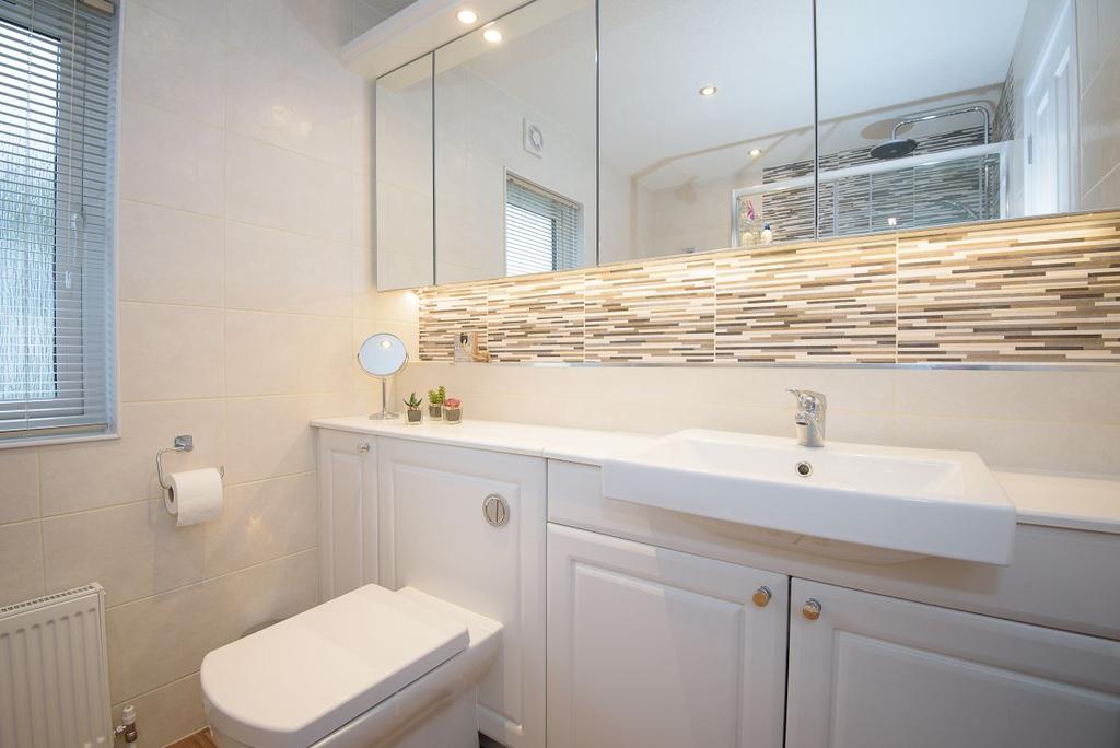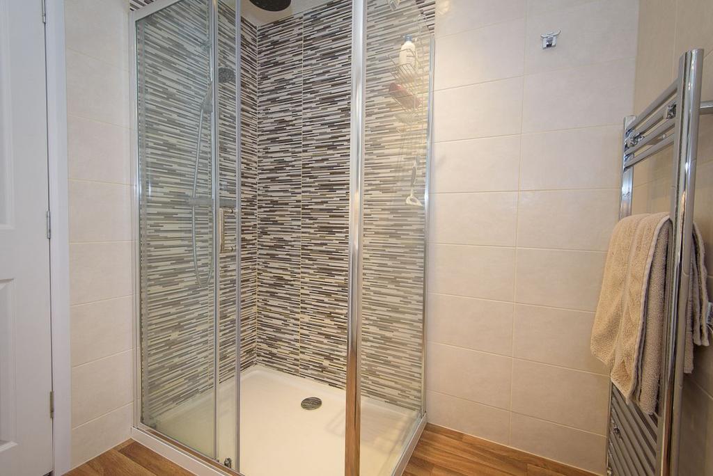 Double glazed obscure window to the side. Fitted with a double walk-in shower, vanity wash hand basin, low level W.C., full width mirrored bathroom wall cabinet, Crome ladder heated towell rail, radiator, vinyl flooring.