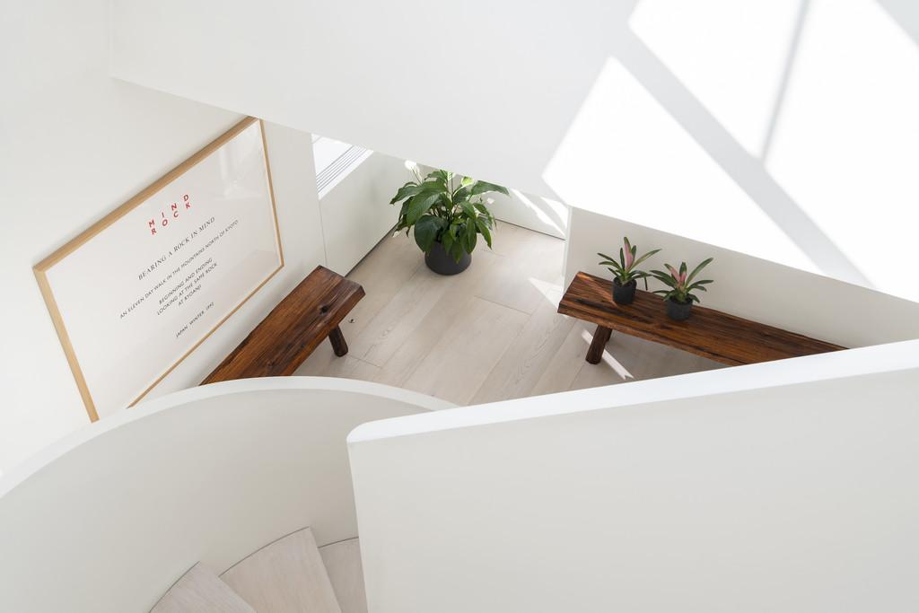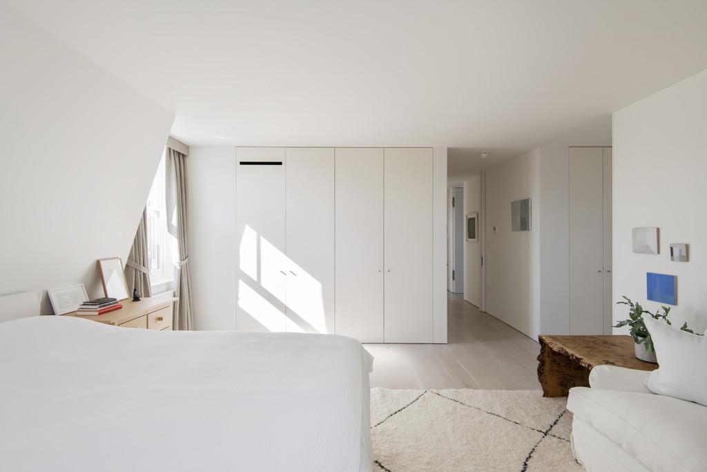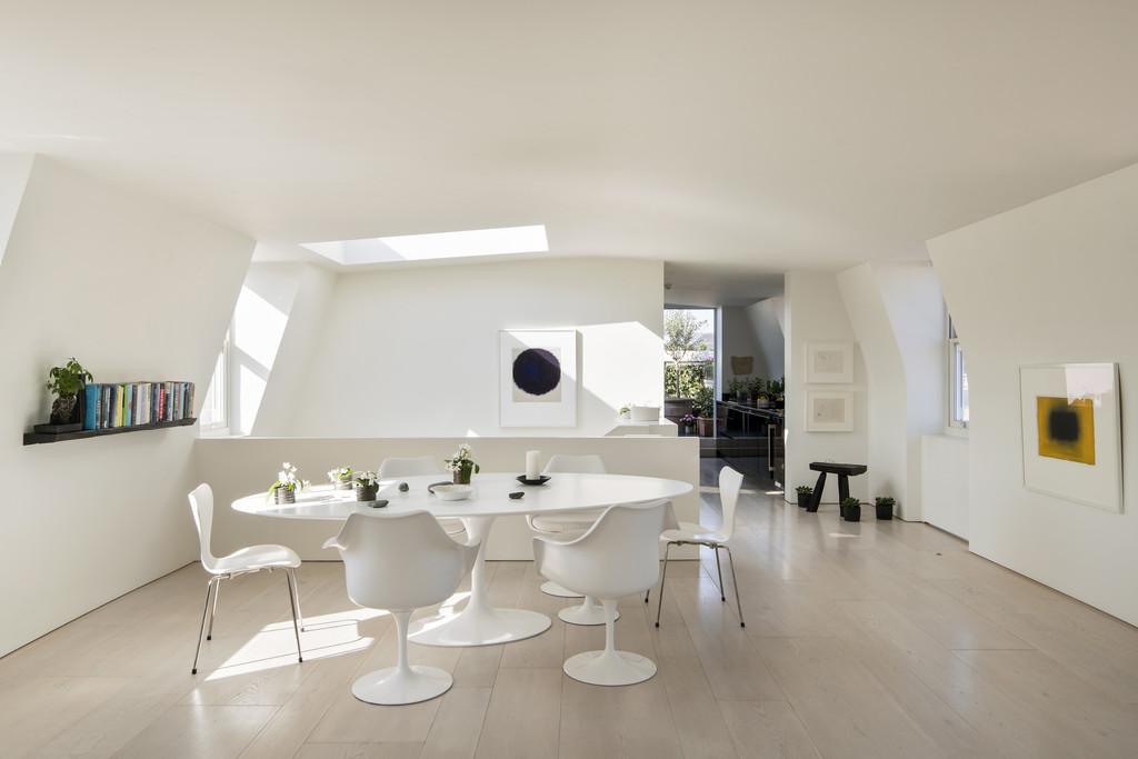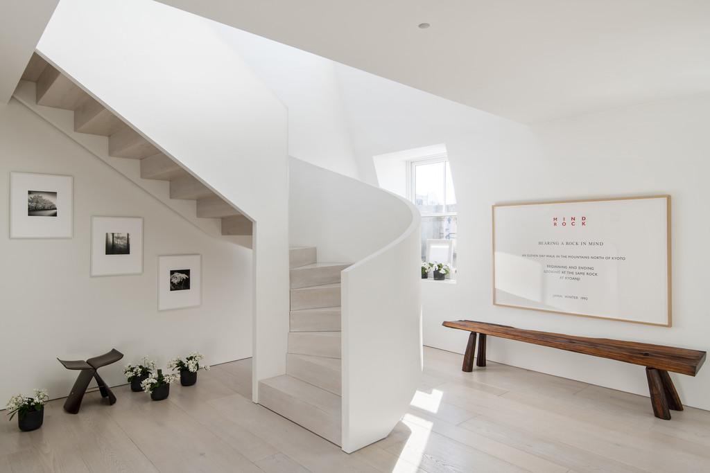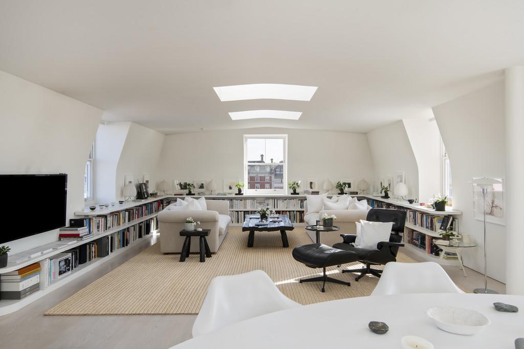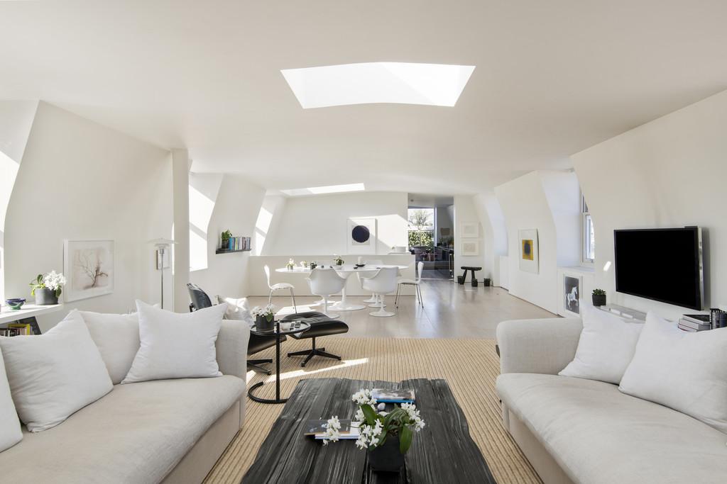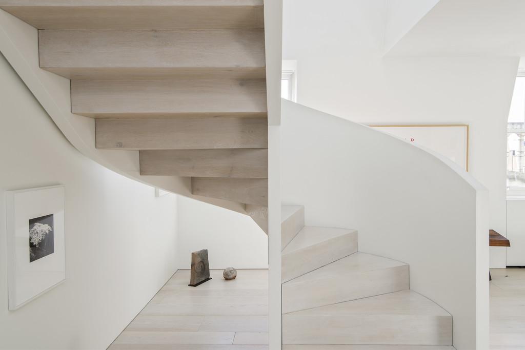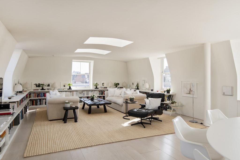 The apartment features exceptional contemporary finishes throughout, with many well considered architectural touches including a beautifully crafted, curved staircase as you enter, linking the two well-proportioned floors of accommodation. Numerous windows feature on all sides, along with a number of skylights on the upper floor that bathe the entire apartment in wonderful light from every angle, creating beautiful lightplay across the upper floor throughout the day.
