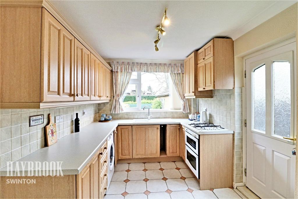 Having fully fitted wall and base units, roll top work surfaces, sink with side drainer and mixertap, space for washing machine, built in oven, tiled splash back, storage area, rear facing UPVC double glazed window, side facing door giving you access into the back garden, access into the dining room and has a wall mounted radiator.