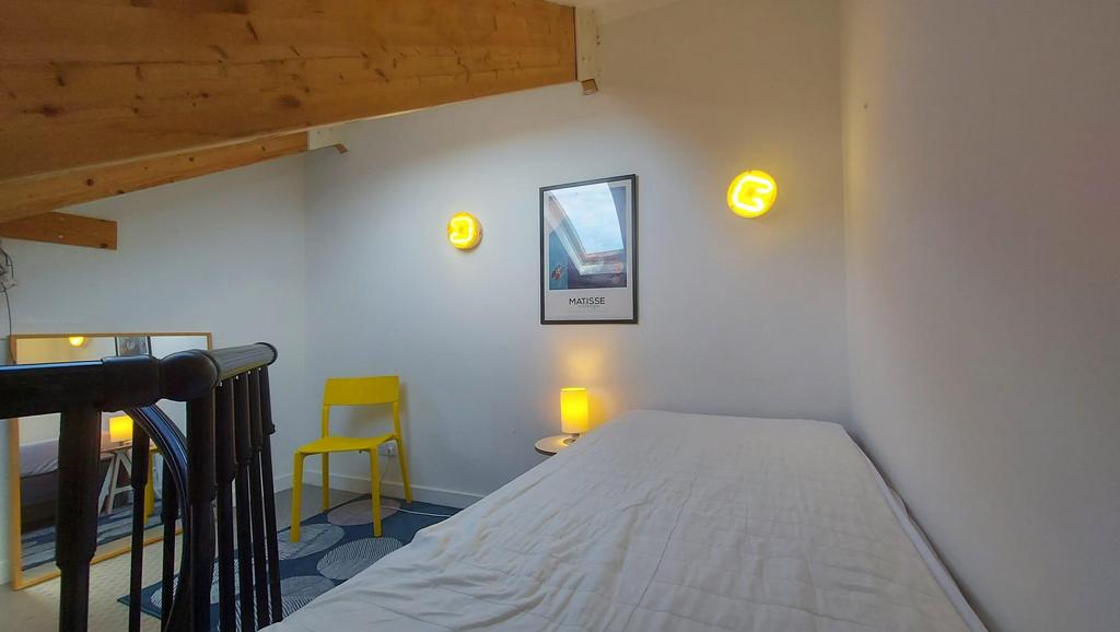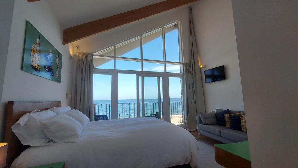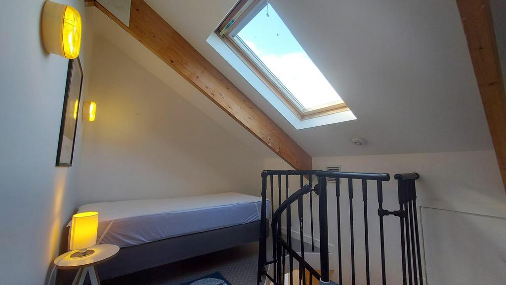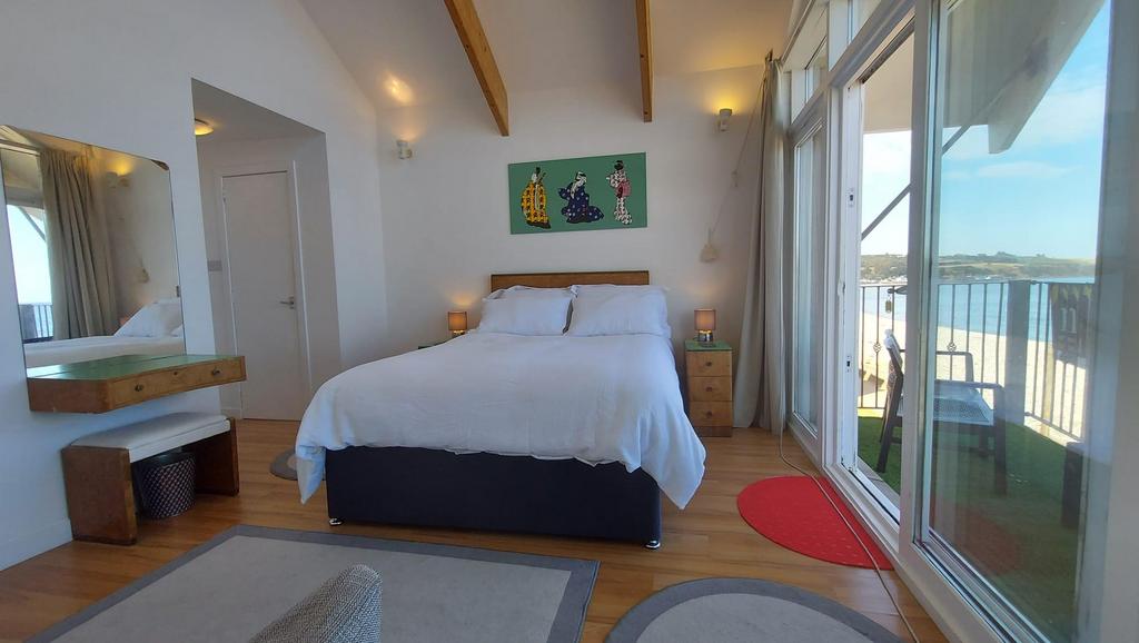 The apartment is built on two levels. The main upper bedroom with exposed beams and vaulted ceiling, and the open plan lounge below, have floor to ceiling windows with sliding doors. Both rooms lead to a full width balcony with seating and panoramic views out to sea.