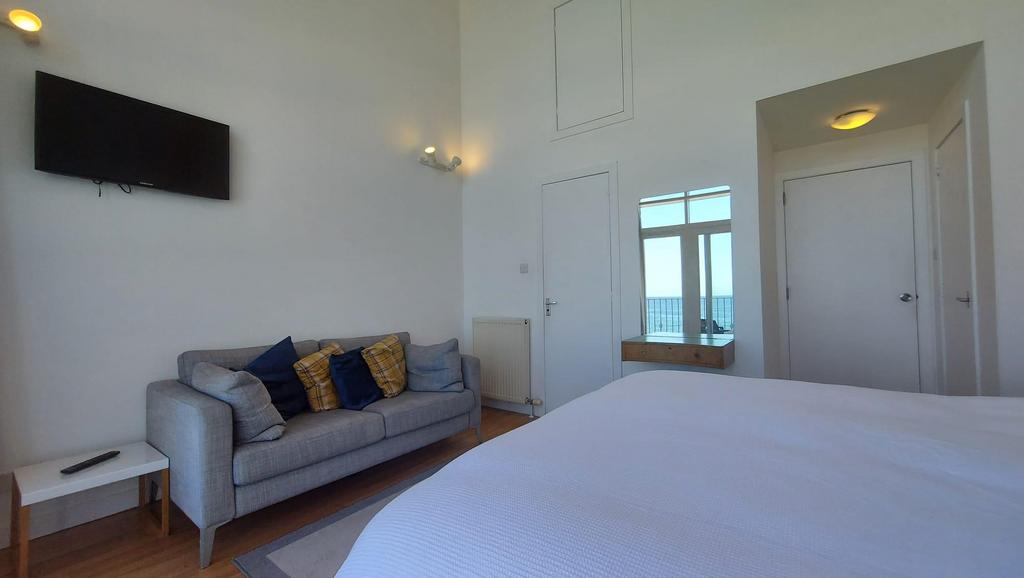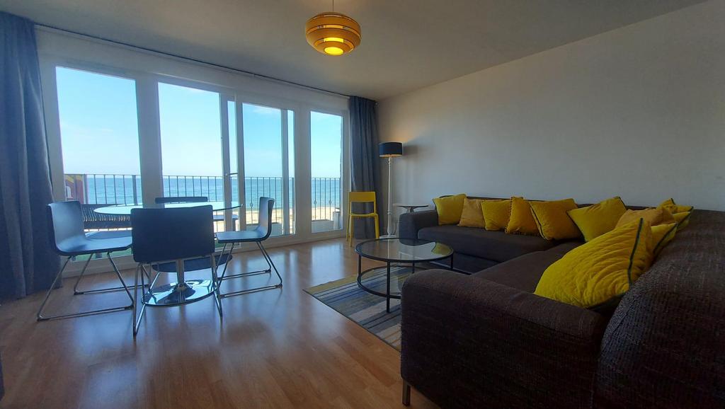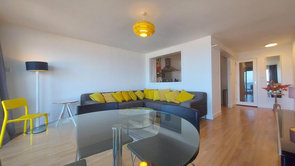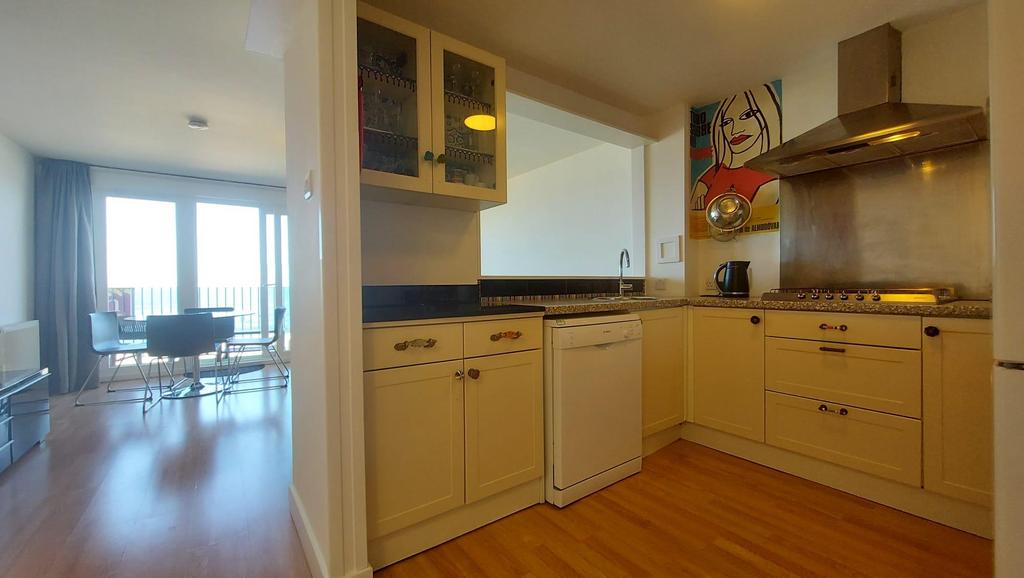 Spacious open plan lounge/kitchen/dining room with balcony and exceptional sea views. Well laid out to accommodate both lounge and dining. Large wall-mounted TV.