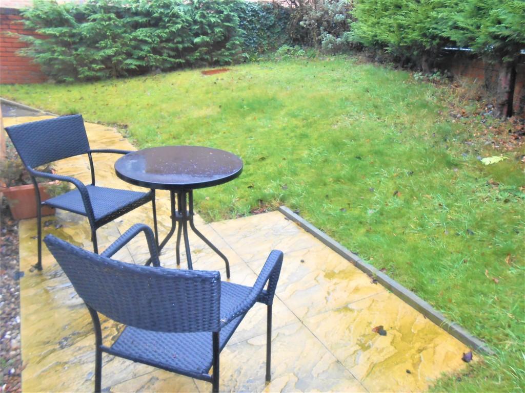 Garden: Slabbed front courtyard garden with lawn, cottage gate to enclosed private lawn and patio, screening trees and rockery. Patio set and outside store.