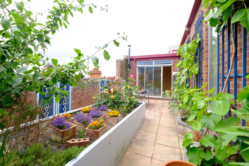 Alongside is the Garden Room approx. 11'8 x 10'5 and having vinyl tiled floor under a raised wood burning stove to one corner and double glazed sliding door enabling direct access to the Patio. This has a brick wall to its outer side from which there are terrific views across the Wye Meadows. Five low brick planters alongside the brick wall of the Garden room grow fig or other climbing plants.
