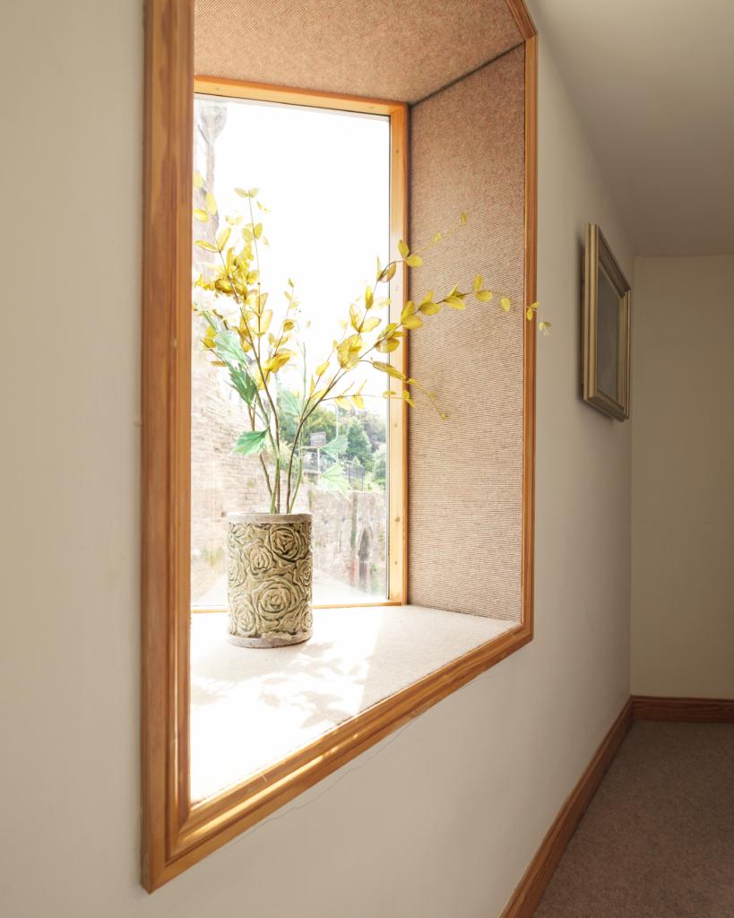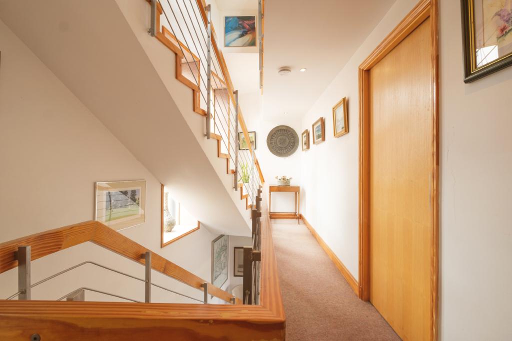 First Floor Galleried Landing with superb morning light admittance, through the double glazed, oriel windows. Fitted carpet and downlighter spot. Door to shelved linen storage cupboards. Fitted book shelving to one wall.
