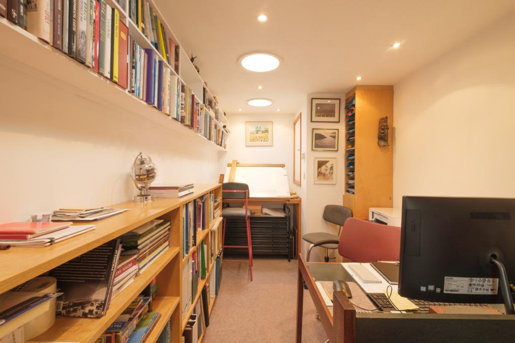 Office/Study of max. dimension approx. 17'1 x 7'0 and having extensive shelving to walls, desktop and three Mono sun pipes above in addition to the window and recessed downlighter spots.