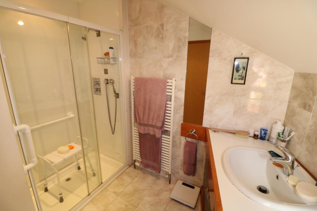 Bedroom Four approx. 14'6 x 9'6 and having double glazed windows to two elevations and access hatch with fold way aluminium ladder allowing access to Capacious Roof Storage Void with additional hot water cylinder. Double doors to built in wardrobe. Further door to En-Suite Shower Room and W.C. with large shower cubicle, wash hand basin and low level W.C. Heated towel rail/radiator. Dual voltage shaver point.