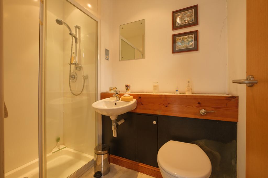 Bedroom Three approx. 11'2 x 6'8 with window overlooking river. Double doors to built in wardrobe and door through to En-suite Shower Room and W.C. with large shower cubicle, wash hand basin, and low level W.C. Heated towel rail/radiator. Dual voltage shaver point.
