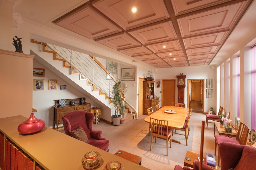 The cleverly designed accommodation occupies the central portion of the structure. To the lowest level is the versatile 45' Recreation room, whilst to the northern elevation is the exceptionally spacious double garage, workshop and wine cellar! Many features of the construction have been designed to mitigate road noise. These include reinforced concrete floors, 6/12/6 double glazing to all rooms, cavity sound absorbent blockwork walls and other features. Central heating is from a Rehau underfloor system, even including the double garage and workshop! In addition to being a unique family home, the versatile 45' ground floor recreation room offers scope for many other potential uses (subject to consent) including Professional offices (eg. Solicitors/Accountants, Physiotherapy Clinic etc.)