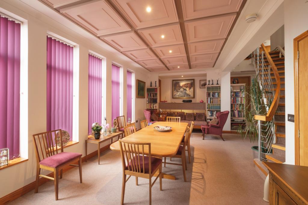 Dining/Reception Room of overall max dimension approx. 24'0 x 17'11 with five tall narrow windows admitting much light, and having a glazed door out onto the small terrace, from which there are stunning views across the River Wye. Most attractive moulded ceiling panels and downlighter spots. Extensive fitted bookshelves to one wall and fitted carpet throughout. Capacious storage cupboard containing hot water cylinder serving shower room over and electric distribution boards.