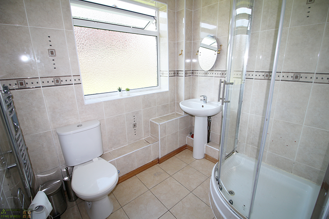 This shower room includes a seperate shower cubicle with an electric shower, pedestal sink, low level Wc, storage cupboard, electric towel rail, partly tiled walls in beige, cream floor tiles, window to the rear elevation and centre ceiling light.