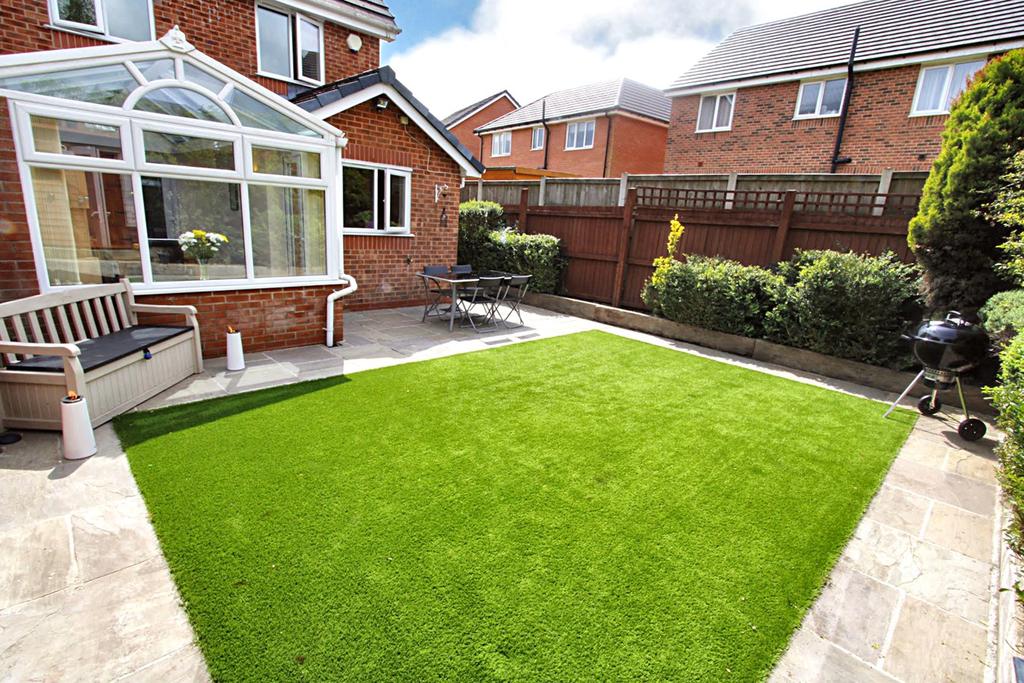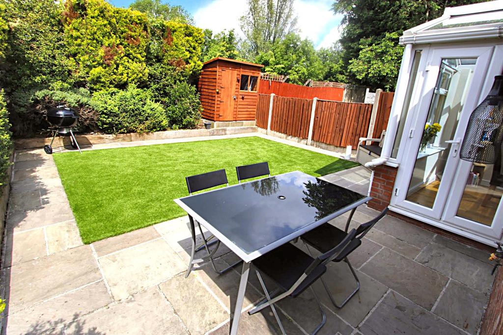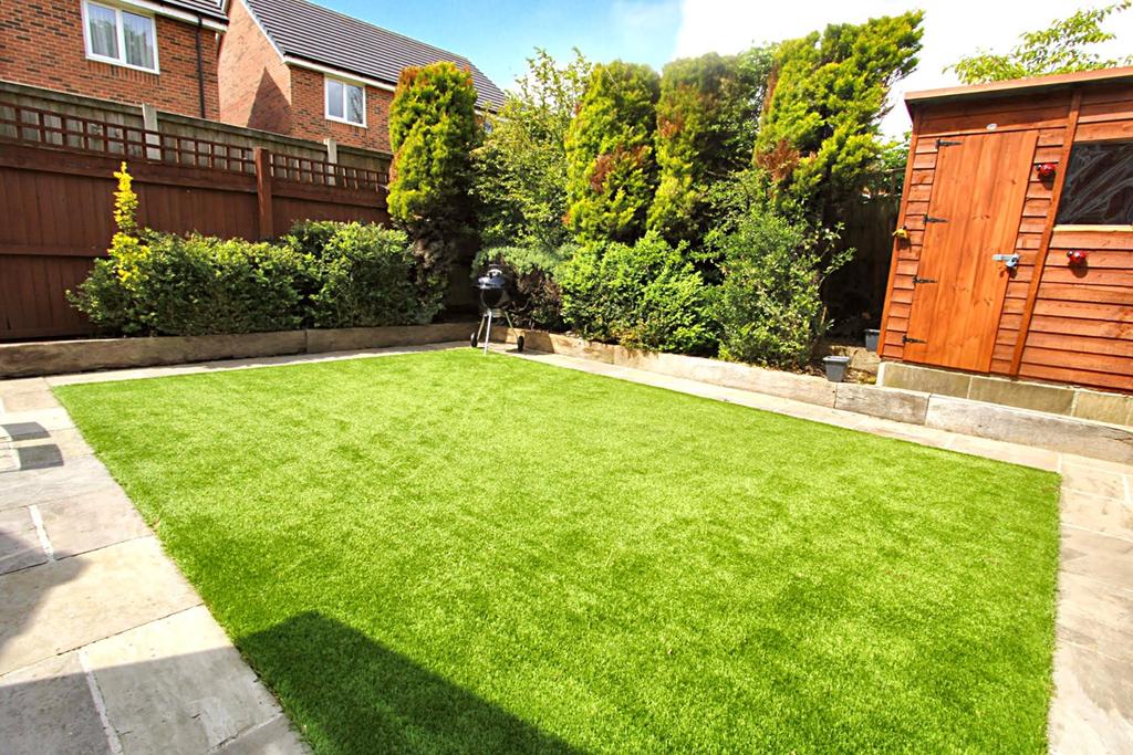 Exceptional rear garden with Indian stone patio and premium Wonder Yarn artificial lawn area. Shed to the rear of the garden. Long side access path. Garage and shed.