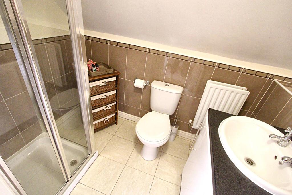 Modern shower room with three piece suite. Partially tiled walls. Sloping ceilings.