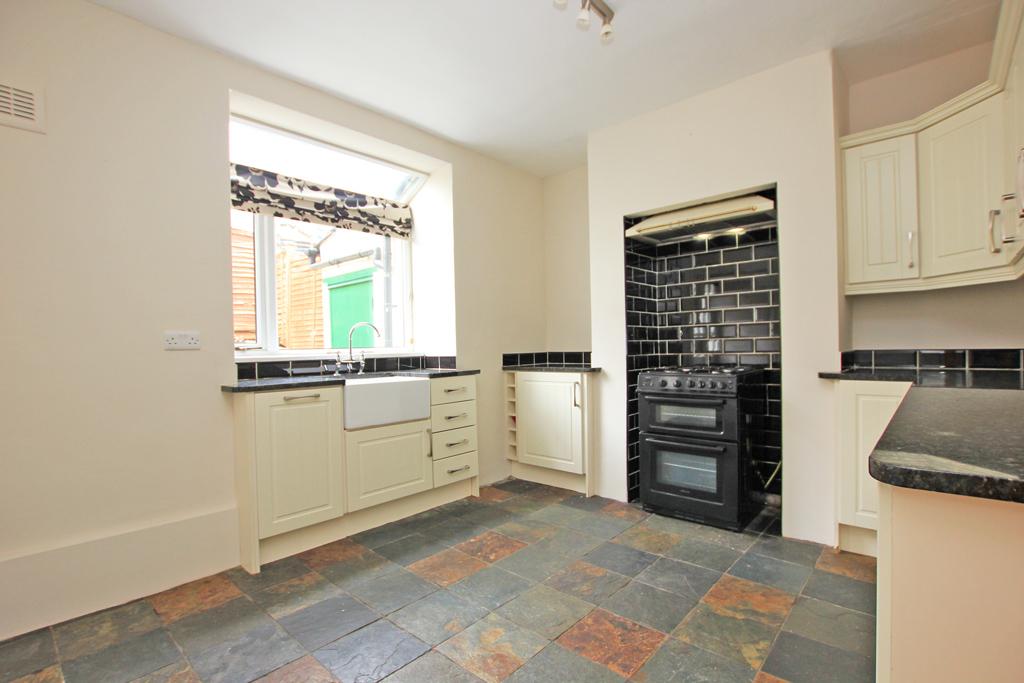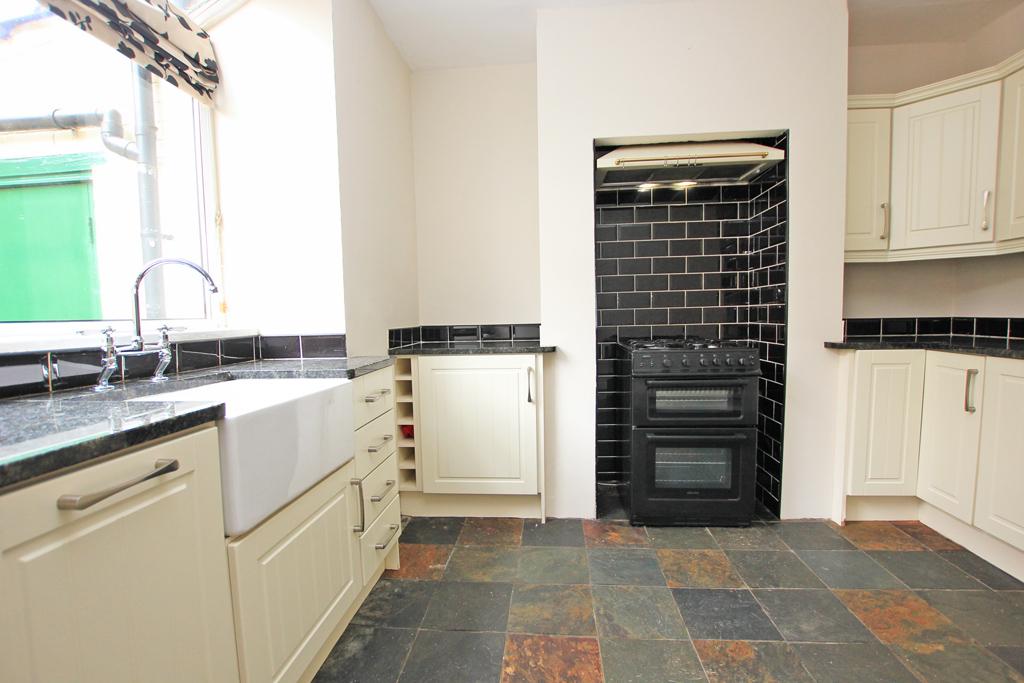 11'7" x 10'5" well equipped with a range of cream fronted base and wall units providing contrasting granite worktop surfaces having matching upstands. White glazed Belfast sink. Gas cooker point and a fitted extractor hood above in a recess with a black metro tiled surround. Electra oven and grill with a four ring gas hob. Integrated fridge. Integrated dishwasher. Multi-coloured slate tiled flooring. Double central heating radiator. UPVC sealed unit double glazing.