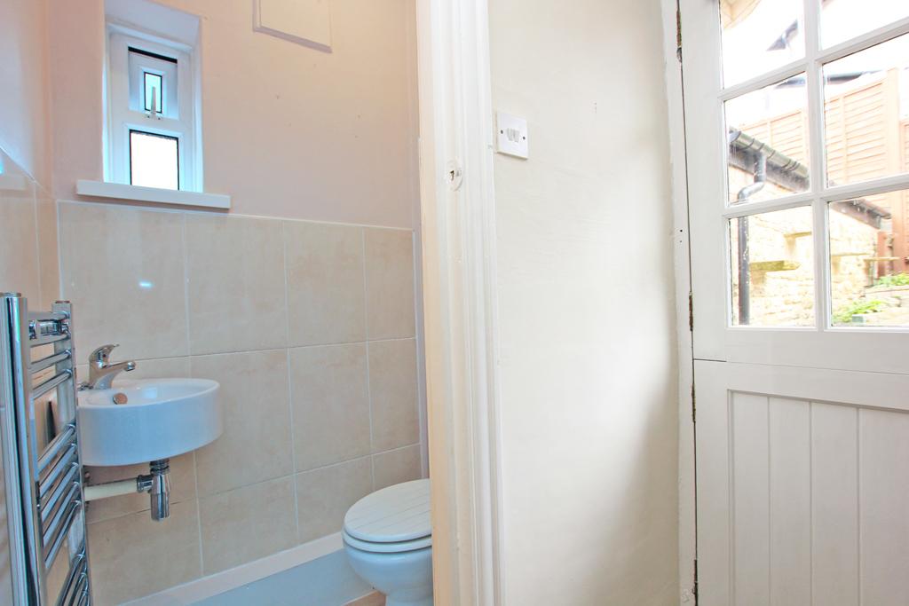 With a two piece white suite comprising a low suite WC and a hand wash basin. Contrasting half height wall tiling and also tiled flooring. UPVC sealed unit double glazing. Ladder central heating radiator in chrome finish.