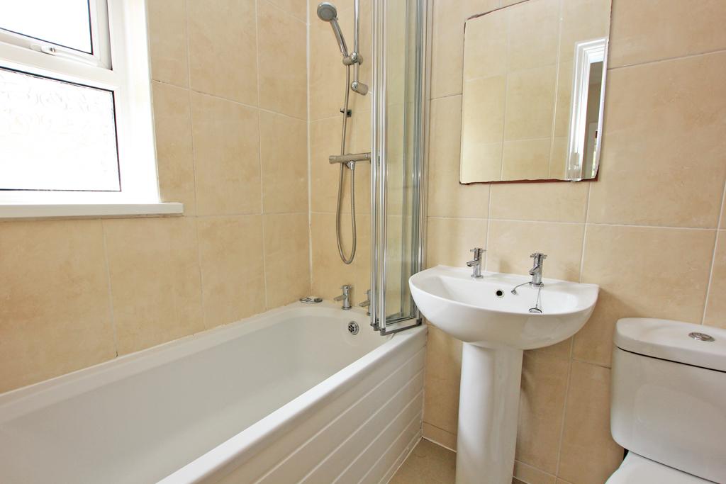 With a three piece white suite comprising a panelled bath having a folding screen and a thermostatic shower together with a pedestal wash basin and a low suite WC. Contrasting full height wall tiling and also tiled flooring. UPVC sealed unit double glazing. Ladder central heating radiator in chrome finish.