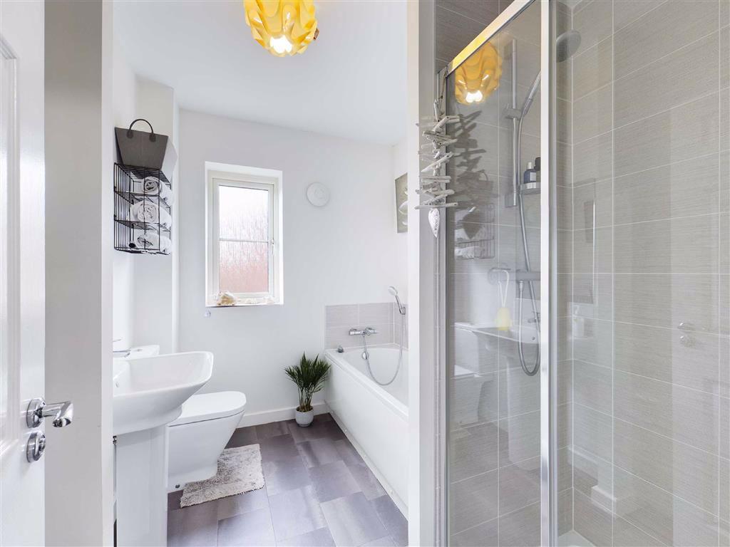 Bathroom - UPVC double glazed window to rear aspect, panelled bath, pedestal wash hand basin, low level W.C., extractor fan, shaver light point, tiled flooring, heated towel rail, ceiling light point.