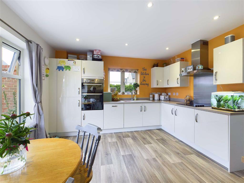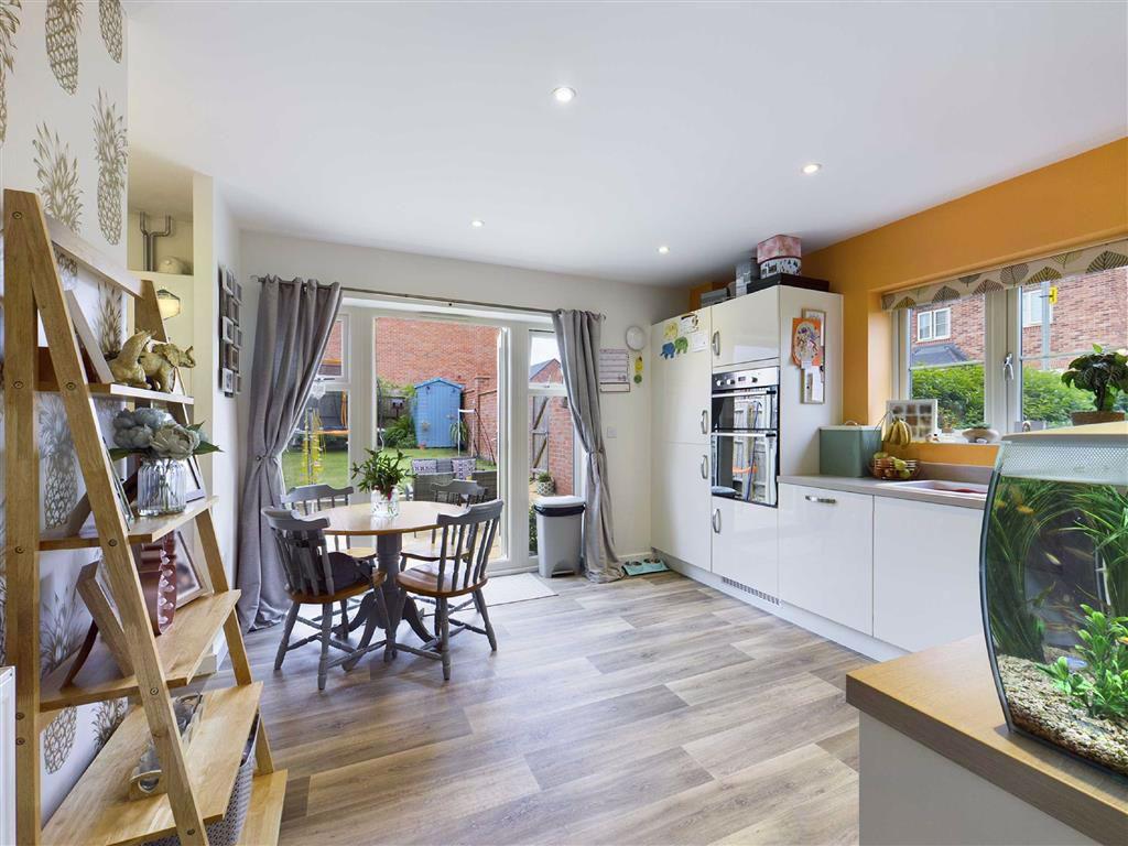 Kitchen - 12'6" x 12'0" (3.81m x 3.66m) - UPVC double glazed window to side aspect, radiator, range of eye level and base storage units with work surfaces over, ceramic one and a half bowl sink drainer unit with mixer tap over, electric oven and hob with extractor hood over, built-in dishwasher, vinyl flooring, ceiling mounted spot lights, opening to utility, double glazed patio doors to rear garden.