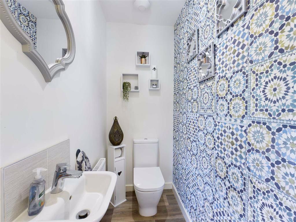 Cloakroom - Radiator, vanity wash hand basin with tiled splashbacks, low level W.C., vinyl flooring, ceiling light point.